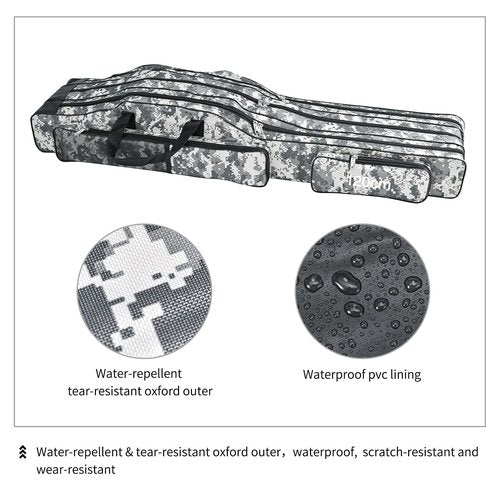- Multiple Compartments: The 3 Layer fishing carrier bag features multiple compartments and layers, providing ample storage space for organizing and carrying to fit your rod and reel and other accessories. Multiple pockets provide a large capacity for your fishing tackles. The long side outer pocket of this fishing rod case is ideal for storing fishing equipment such as Carp Alarms,rods pod, fishing nets ect.