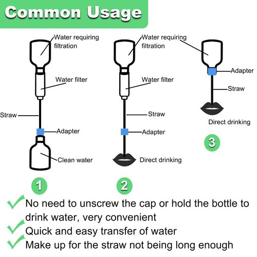 - Features: With the adapter, you don't have to take out your water bag to get a drink of water. You can realize a long distance connection between the filter and the water that needs to be purified, no longer limited by distance. The gasket Seal prevents leakage problems and reduces water waste