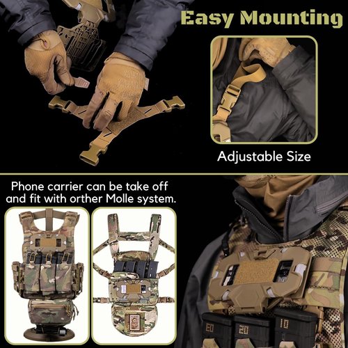 - EASY MOUNTING:Adapted to the MOLLE system for many tactical armor vests, easy to mount, detach and securely worn. Portable Chest Vests are optionally offered that are lightweight, adjustable, and quick buckle on/off. In addition to use as tactical, security, police gear stand accessories. It is also an hiking camping outdoor survival aid kits for using apps such as navigation, recording, communication, entertainment etc.