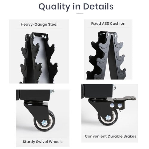 - Maneuverable Sturdy Wheels: 360-degree swivel wheels enable quiet and smooth rolling even with heavy load on it, making it extremely easy to bring your dumbbells to you. Protected by a PU layer, wheels roll silently with lifetime durability. Two of the four casters also have an integrated brake to keep the dumbbell rack in place.