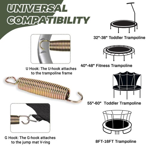 - 【8 Precise Sizes】Match trampoline with 3.5"-8.5" hook-to-hook lengths (unstretched). We strongly recommend measuring your original springs when fully relaxed and compare diameter for perfect fit. Eliminate guesswork for safe installation.