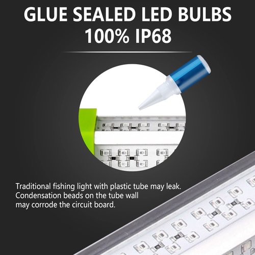 - ?�Never Leak?‘Solid epoxy is filled on the surface and inside of the fishing light, 100% IP68 (The highest degrees for dust and liquid resistance). Prevent circuit board rusting and burned out, operating is safe. This submersible fishing light can be placed in freshwater or saltwater.