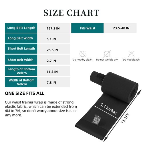 - One Size Fits All: LoyMoo Body wraps for stomach is designed to accommodate all body types with its one-size-fits-for all size within waist 23.5 IN-47.5 IN waistline. Measuring 157.2 IN in length and 5.1 IN in width, this waist trainer for women offers versatility in snatching your waist, allowing you to adjust the tightness to your preference to your preference for ultimate comfort