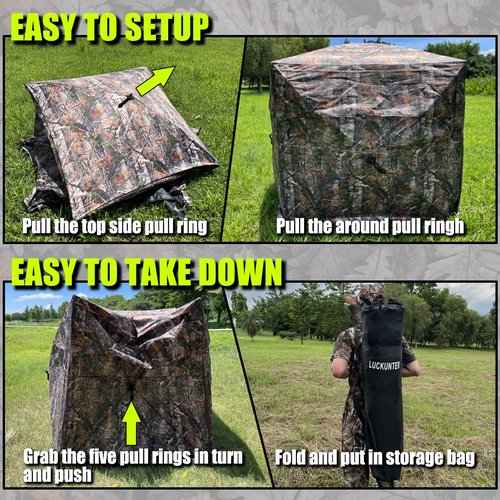- ?�Easy to Use??It is built of hub system, which makes setup/take down very easy.With a little practice setting the blind up can be accomplished quickly. And it comes with a portable carry bag, tie down stakes (8 pieces) and high wind ropes (4 pieces), which help you take it everywhere easily.