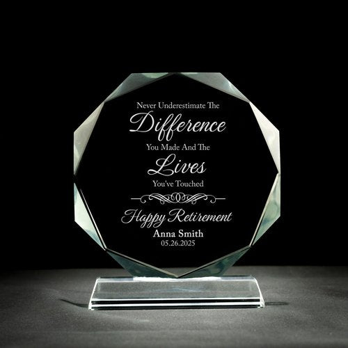 Details: Commemorate a special milestone with this Personalized Retirement Crystal Award, a stunning Custom Glass Trophy for departing employees. This Engraved Plaque offers a timeless, elegant design, perfect as a Leaving Gift to honor years of dedication. Celebrate their legacy with a meaningful, custom-engraved keepsake they’ll treasure forever!