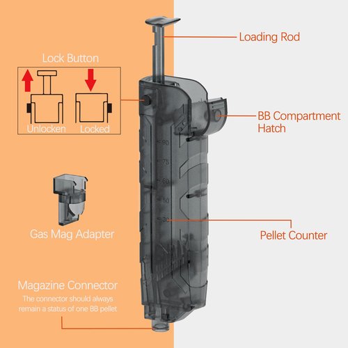 - 【Unique Design】Easy to use, super simple to load. Built-in O-ring in feeding nozzle keeps BBs from falling out. Clear plastic can see exactly how many bbs are left. Fits standard-cap mags, mid-cap mags, shotgun shells, grenades, and revolvers. Gas magazine adapter included.