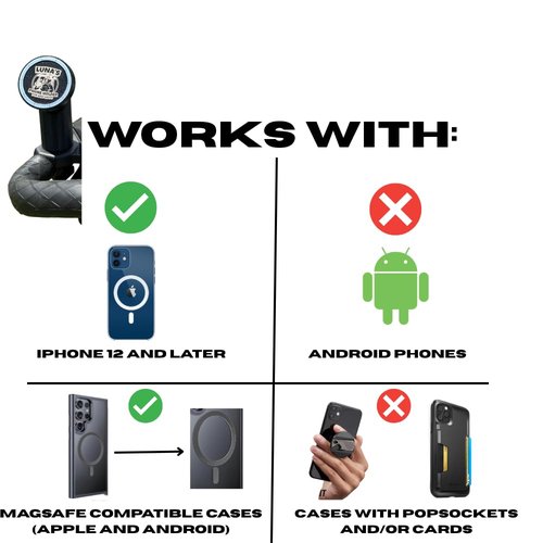 - ⚠️ iPhone-Only Compatibility – This mount is not compatible with Android devices, PopSockets, or wallet-style phone cases. For best performance, use with MagSafe iPhones and slim cases only.