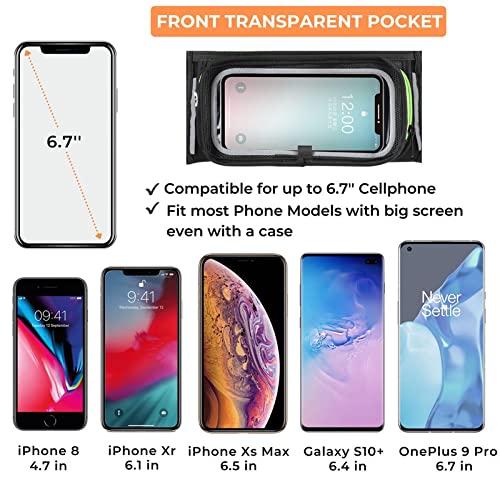 - ☑️Quick and easy to reach your phone. Protective, see-through touch screen window with Velcro design allows you to make calls, check messages, and change music without unzip the pocket. The front pouch fits most Phone Models with big screen even with a case like iPhone 8/Xr/Xs Max or Galaxy S10, OnePlus 9 Pro. Compatible for up to 6.7’’ cellphone.