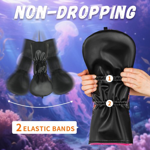 - Vibrant Jellyfish Artistry: Sleek black PU leather base showcases stunning multi-colored jellyfish designs with intricate embroidery and vivid printing. This eye-catching golf driver headcover adds a pop of ocean-inspired flair to your bag