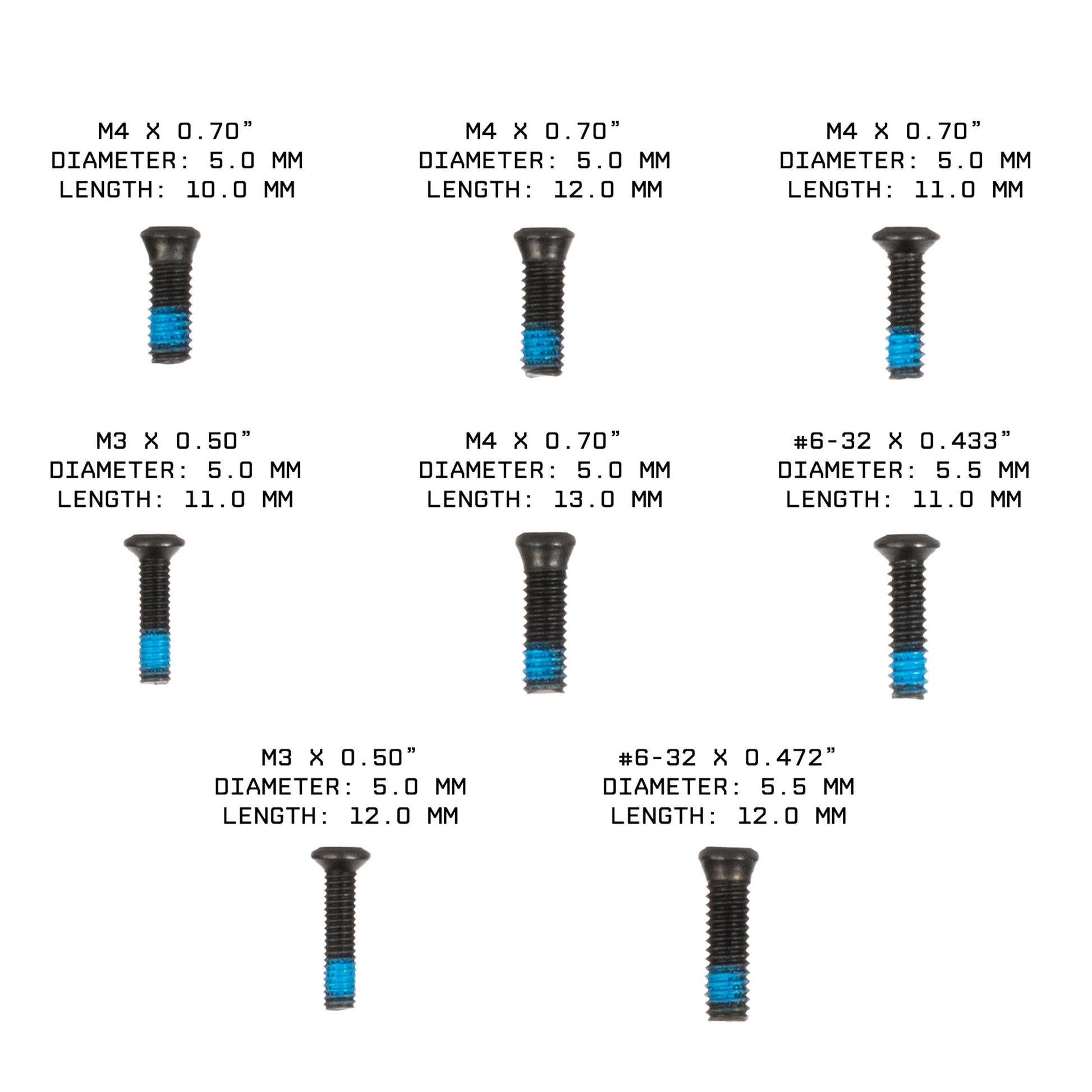 - Includes M3, M4, and #6-32 Screws in multiple lengths to accommodate different makes and models of RMSc cut red dots.