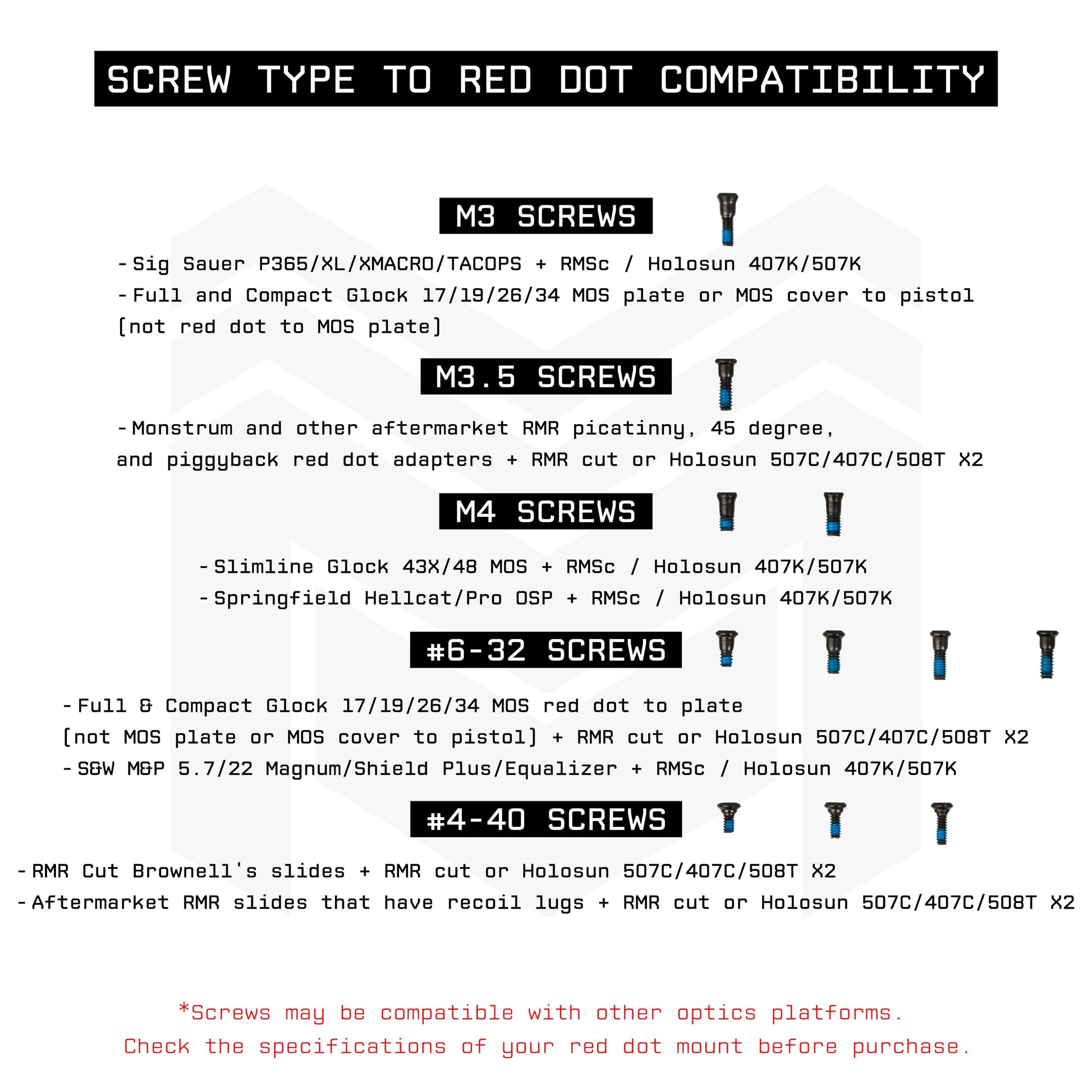 Monstrum Red Dot Screws for RMSc / 407K/507K | M3, M4, and #6-32 | Compatible with Glock 43X/48 MOS/Hellcat OSP with Plate/Sig P365/XL/S&W Smith and Wesson M&P 5.7/22 Magnum/Shield Plus/Equalizer