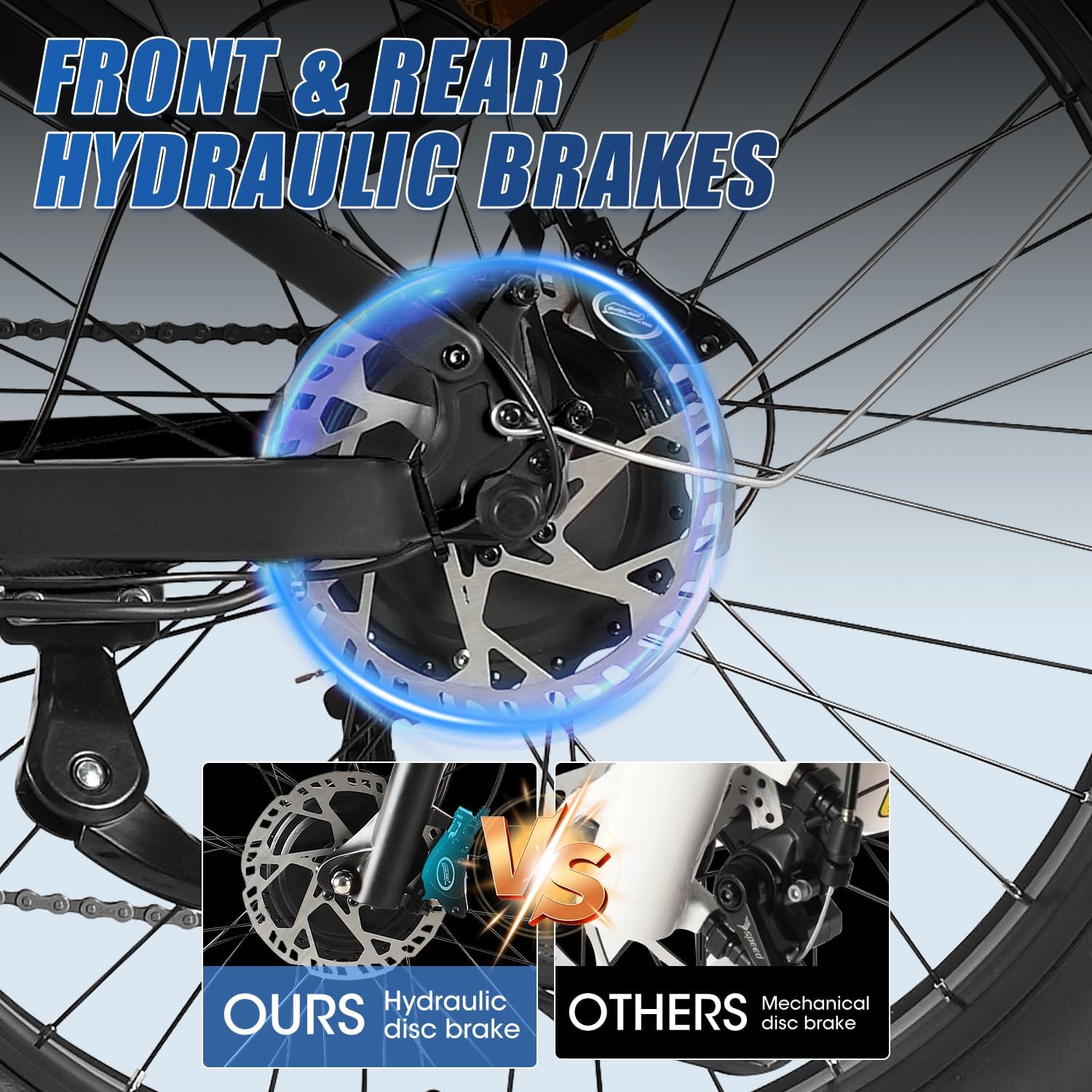 A: The TWO 2500W PEAK motors will lead you conquer the roughest venture. And the Dual 105Nm Torque Motor also helps you conquer slopes of any degree. This dual motor ebike has the power of wildest dreams.