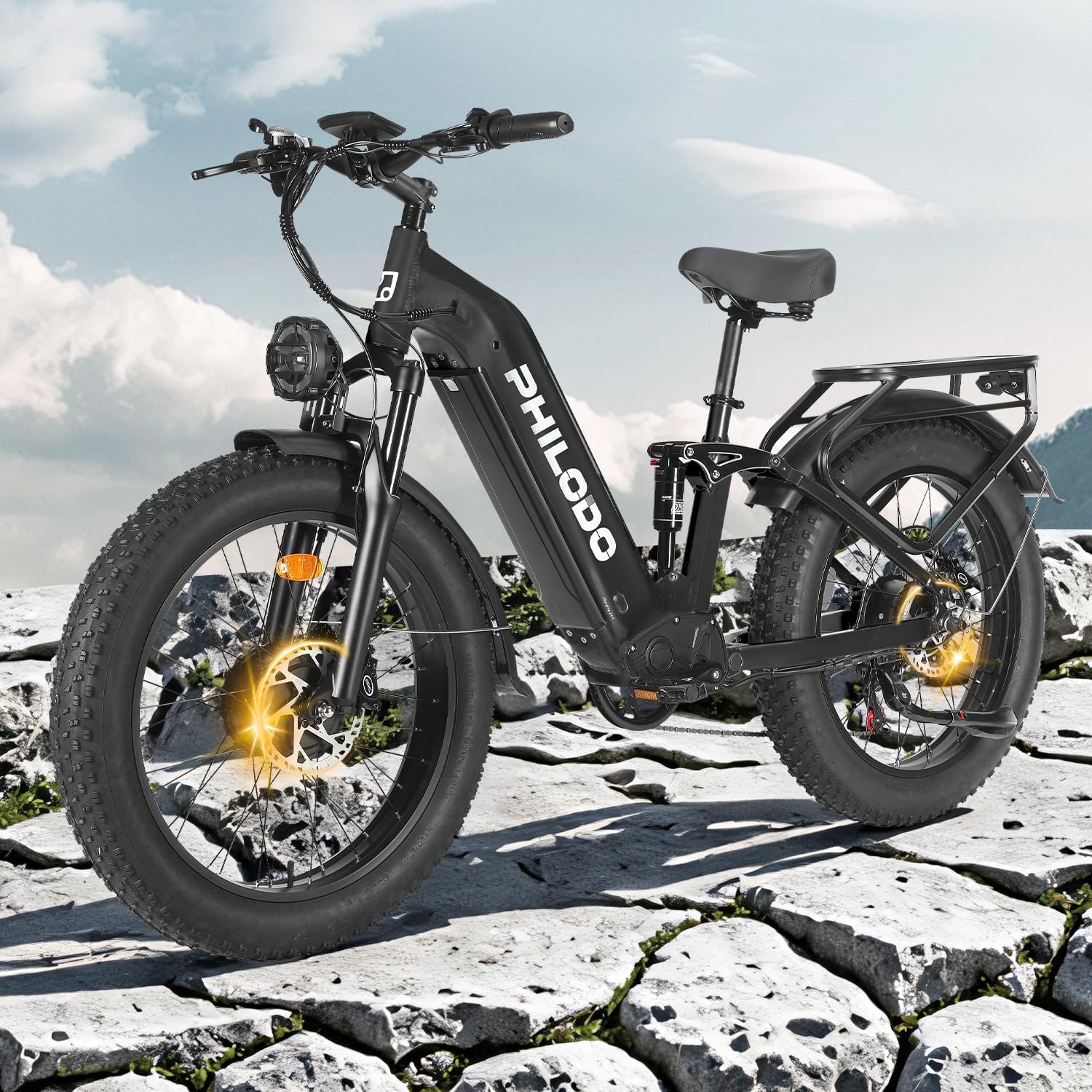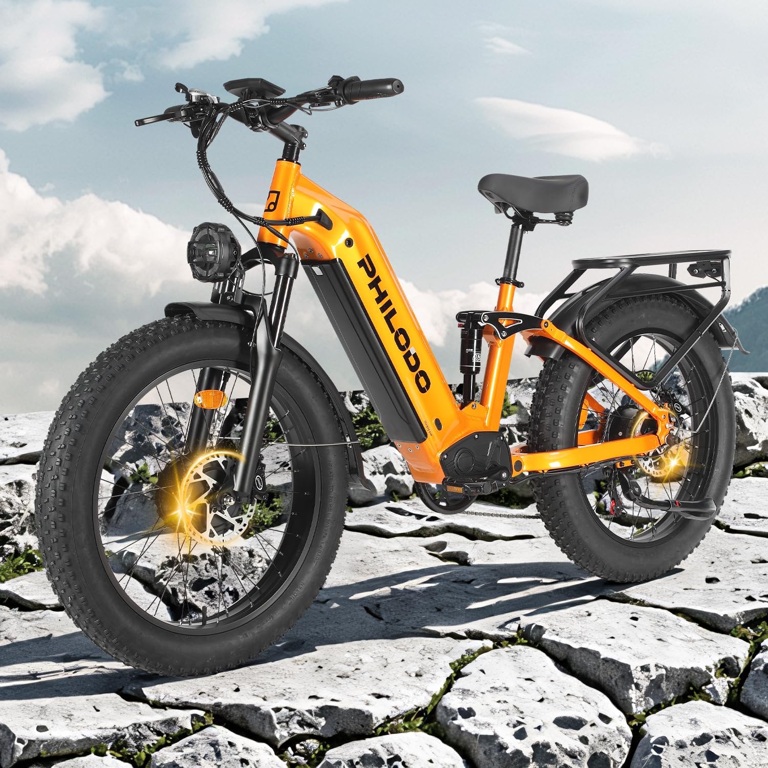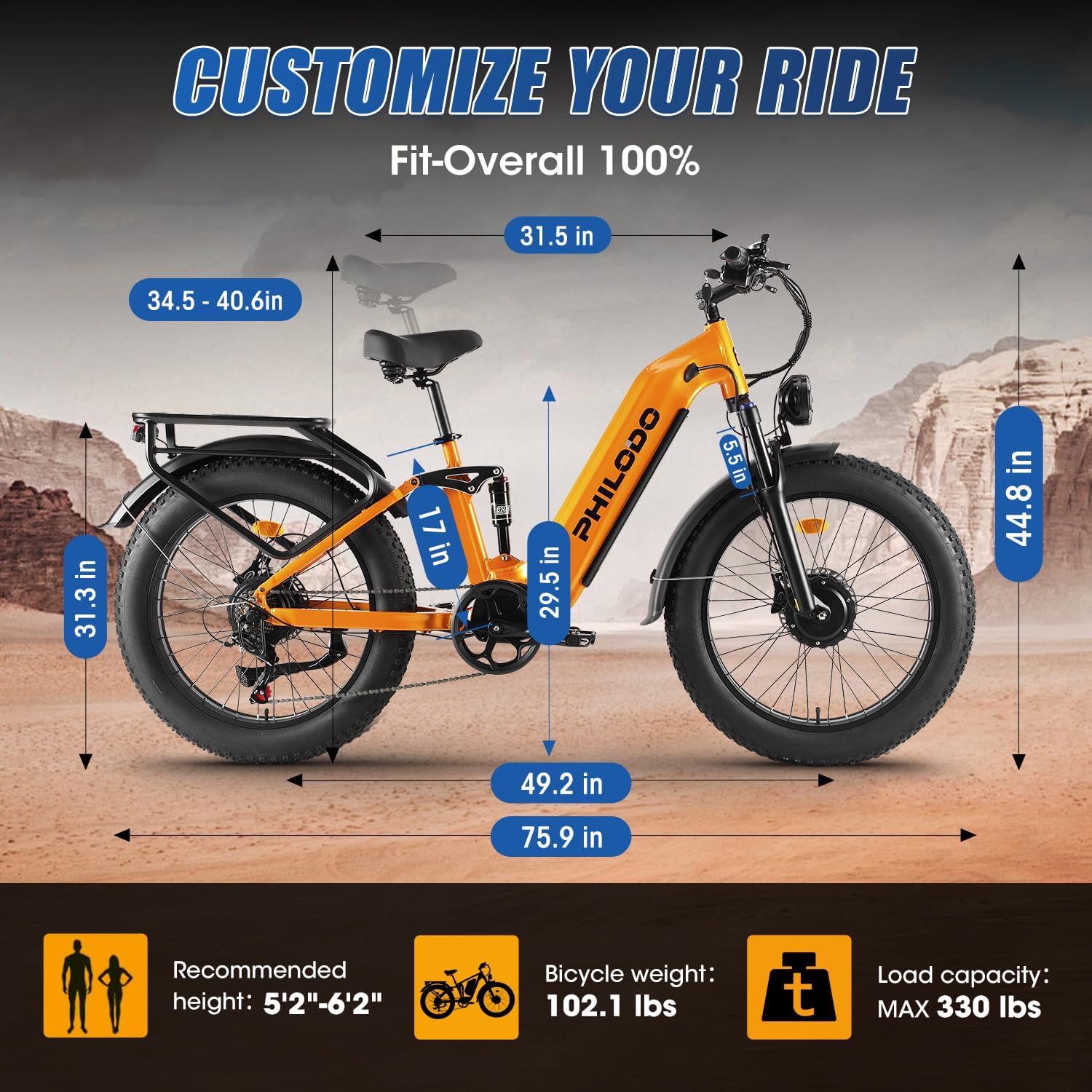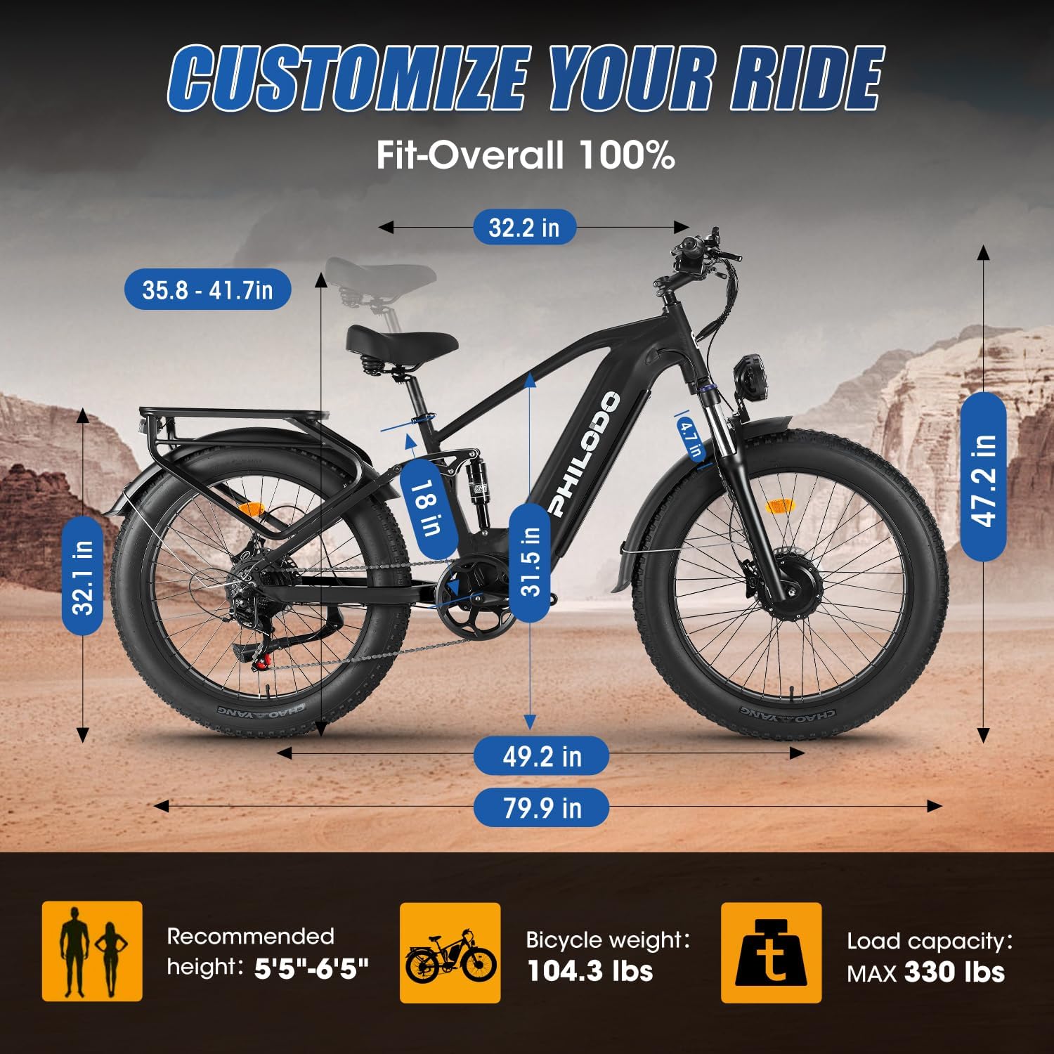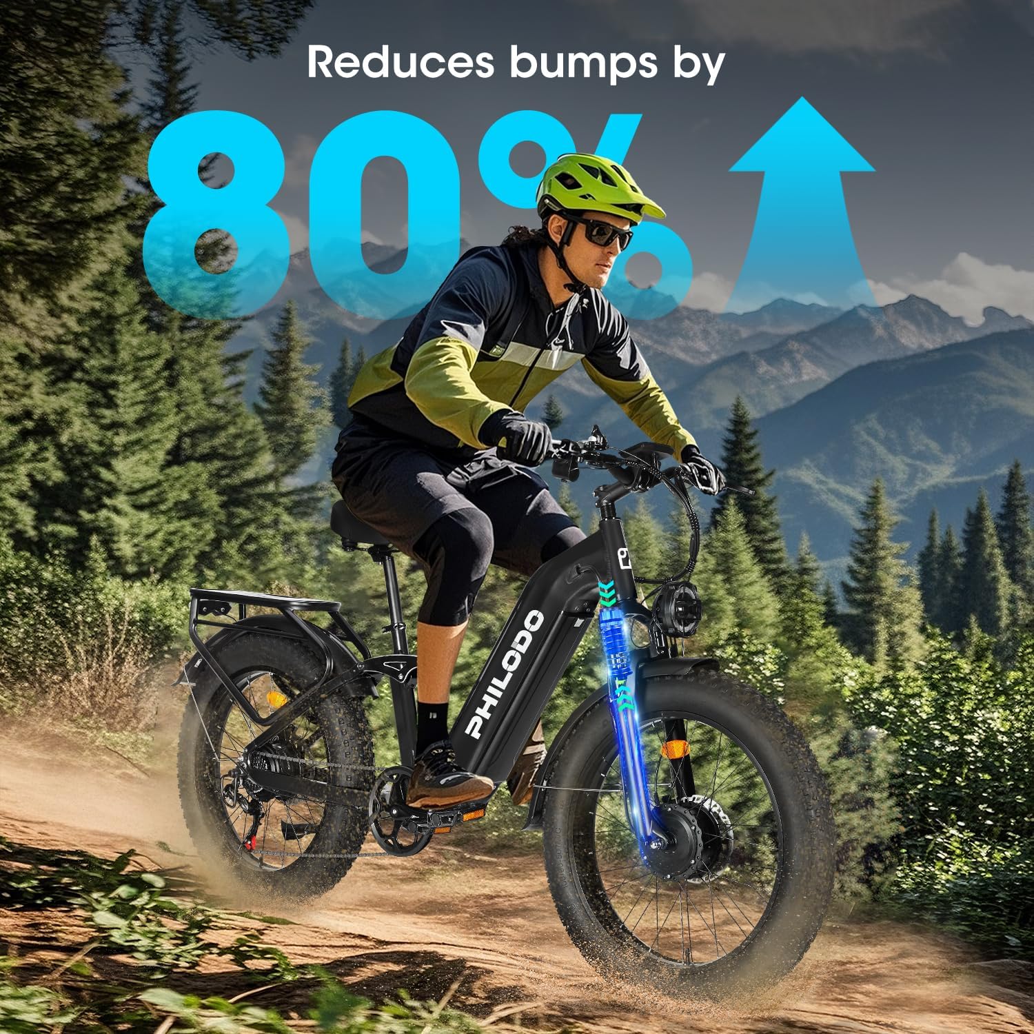 - 🌟 Pro-Grade Full Suspension & 26" Fat Tires – The PHILODO Falcon dual motor ebike features a lockable & adjustable front fork + rear air shock system, delivering superior off-road comfort and impact reduction vs. standard shocks. Paired with 26" all-terrain fat tires, this electric bike ensures maximum traction on sand, snow, trails, and city streets—dominate any terrain with confidence!
