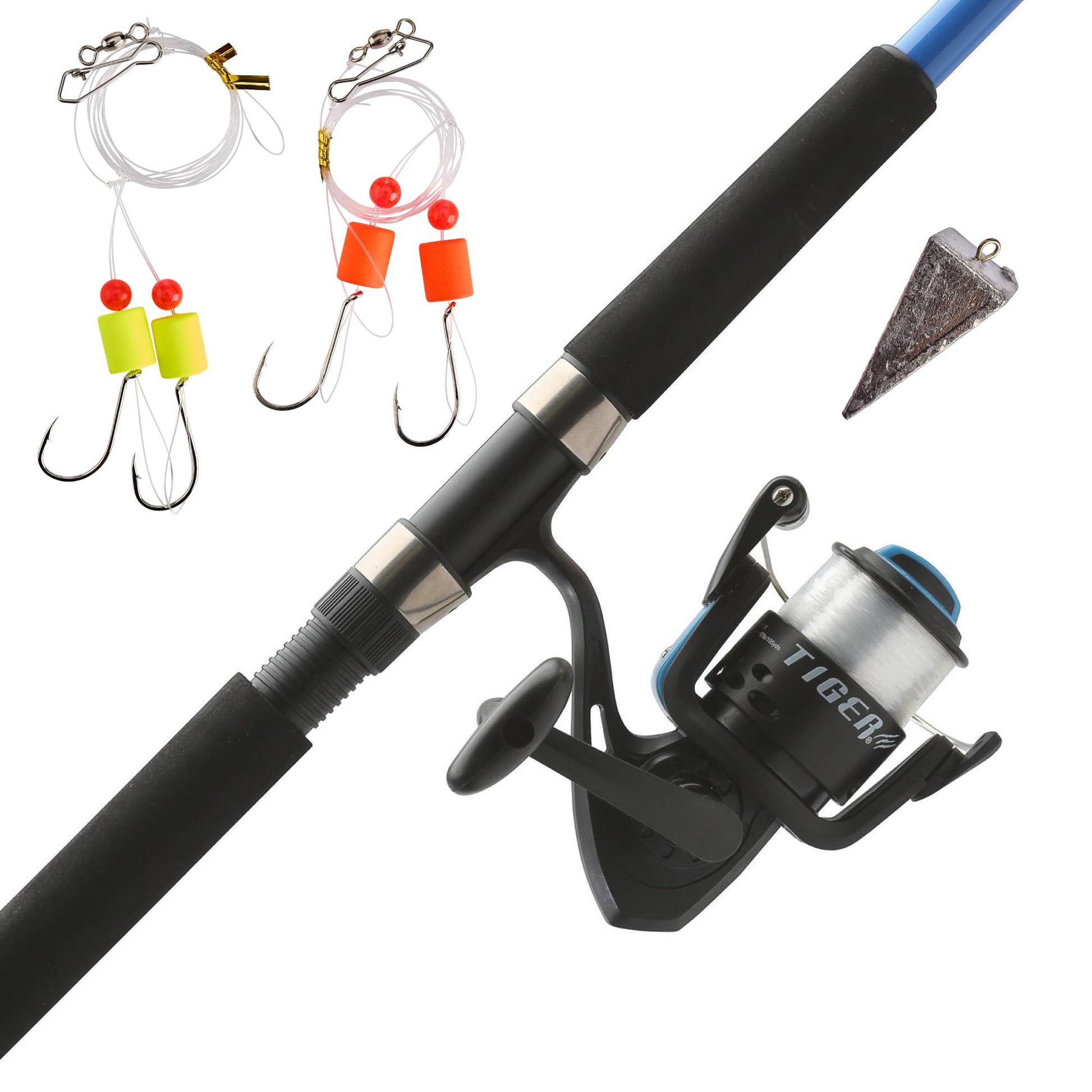 Shakespeare Tiger Surf Spinning Reel and Fishing Rod Combo with Bottom Float Rig, 9' 2-Piece Fishing Rod, Tubular Fiberglass Rod Blank Construction, Comfortable and Durable EVA Handle